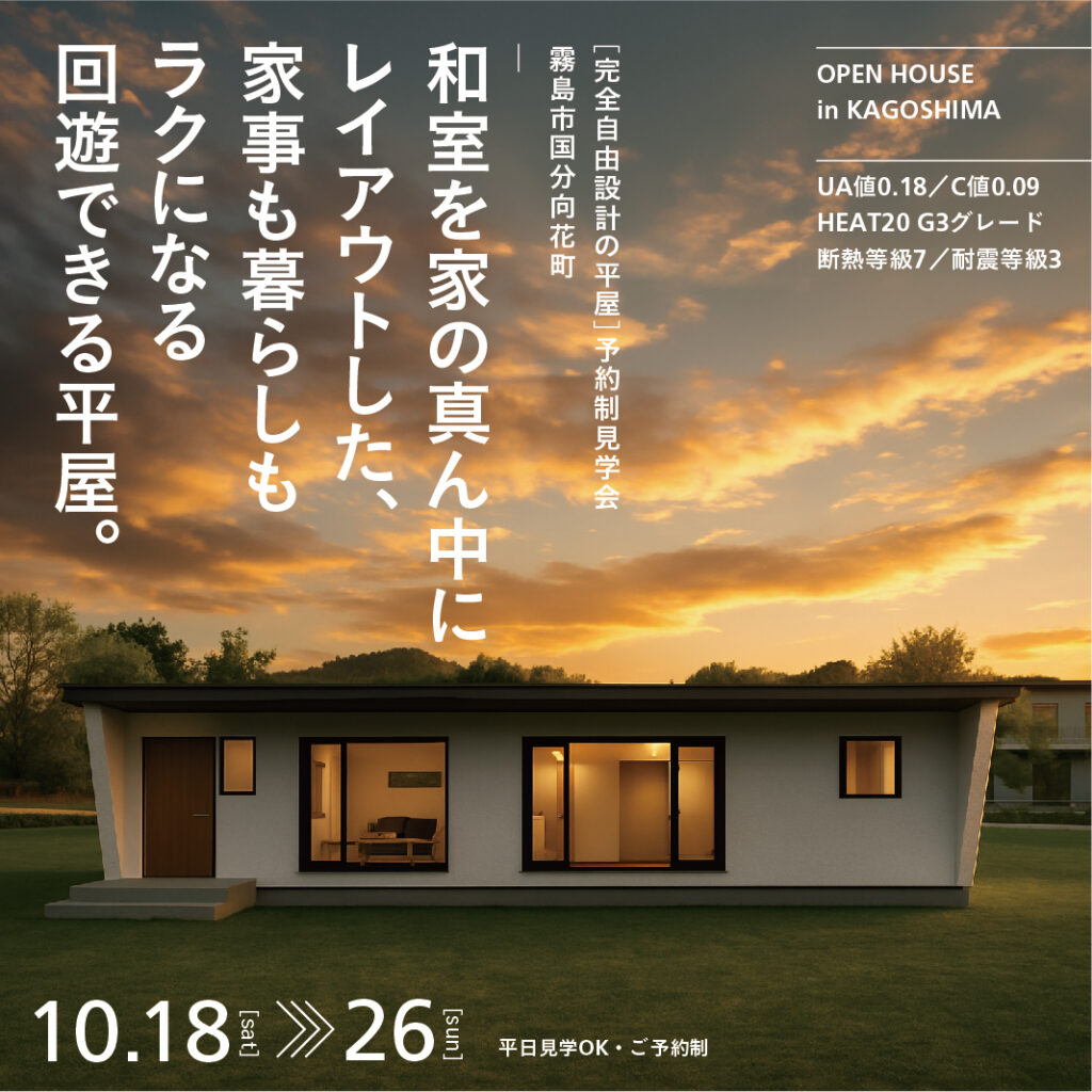 2025年10月18(土)〜26日(日)霧島市国分向花町にてLIFE&Dの注文住宅、「和室を家の真ん中にレイアウトした、家事も暮らしもラクになる回遊できる平屋」の予約制見学会を開催します!
